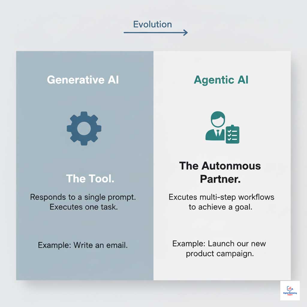 To grasp the significance of Kimi K2, it’s crucial to understand the leap from generative to agentic AI. This evolution marks a fundamental change in how marketers interact with artificial intelligence, moving from a command-and-response tool to a collaborative, autonomous partner.